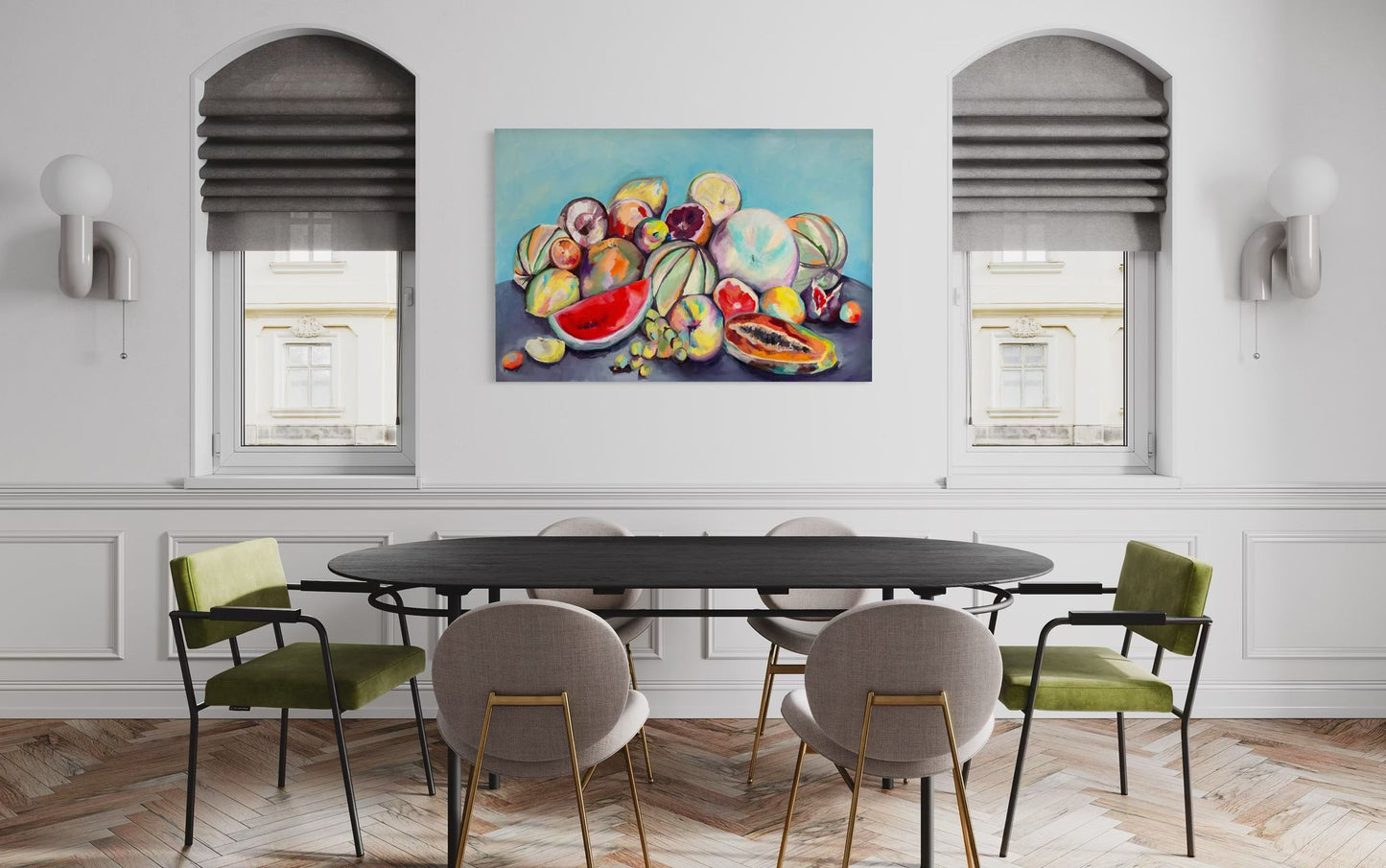 Das beeindruckende Kunstwerk „Alle zusammen“ von Claudia Ditters zeigt eine üppige Anordnung exotischer Früchte in lebendigen Farben, die Freude und Fülle ausstrahlen. Die Komposition vereint Melonen, Granatäpfel, Zitrusfrüchte und mehr auf einem harmonischen Hintergrund, der die Farben der Früchte zum Leuchten bringt. Mit dynamischen Pinselstrichen und intensiven Farbtönen erweckt das Werk die Texturen und Formen der Früchte zum Leben und erinnert an sommerliche Märkte und sonnige Tage. Die klare Farbgebung und die moderne Darstellung verleihen dem Bild eine zeitgenössische Note, die an die Pop-Art erinnert.